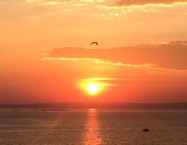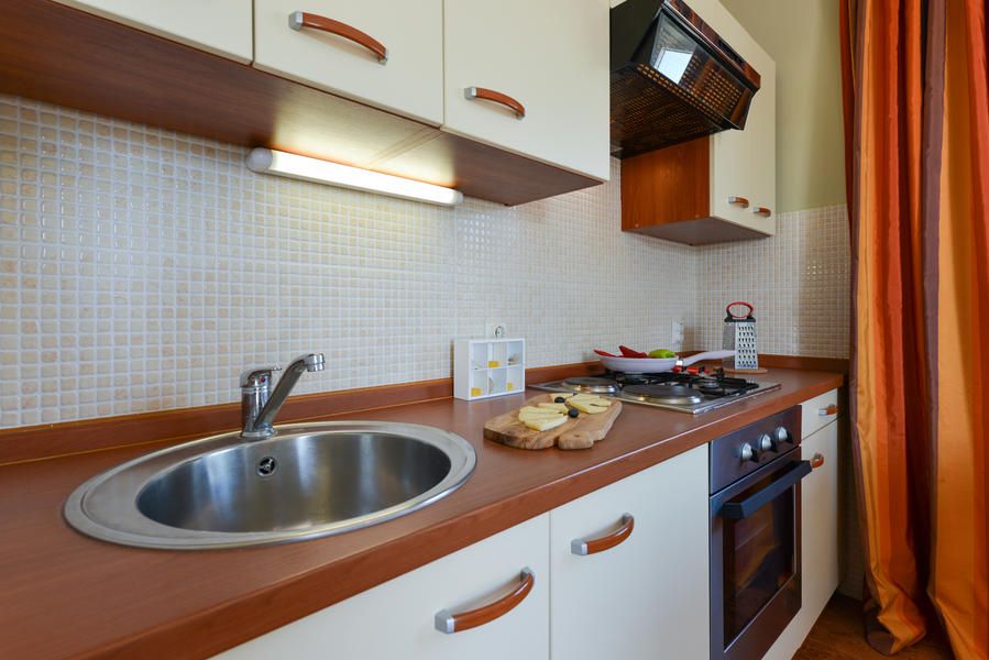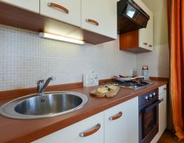 Terrasse Meerblick Küche Backofen Kaffeemaschine Kühlschrank Geschirr und Besteck